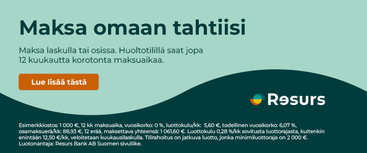 Esimerkkiostos: 1 000 €, 12 kk maksuvaihtoehdolla. Vuosikorko: 0 %. Luottokulu: 5,60 €. Todellinen vuosikorko: 6,07 %. Luoton kustannukset: 61,60 €. Maksettava yhteensä: 1 061,60 €. Osamaksuerä/kk: 88,93 €, 12 erää. Huoltotili on jatkuva luotto, jonka minimiluottoraja on 2 000 €. Luoton muusta käytöstä voi seurata korkeampi tai alempi todellinen vuosikorko. Luotonantaja: Resurs Bank AB Suomen sivuliike.