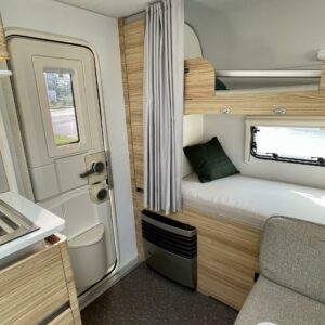 Kassettgardiner, Kassettoalett, Kylskåp, Taklucka, Våningssäng, Golvvärme, Spis, Varmvattenberedare, Tvättho, Frysfack, Parsäng, Elpatron, Trumatic, Stödben, Cykelställ