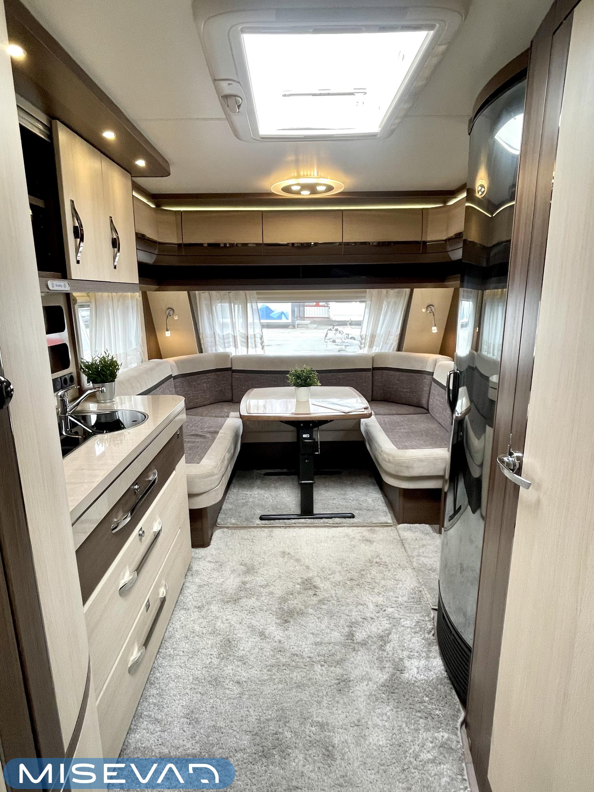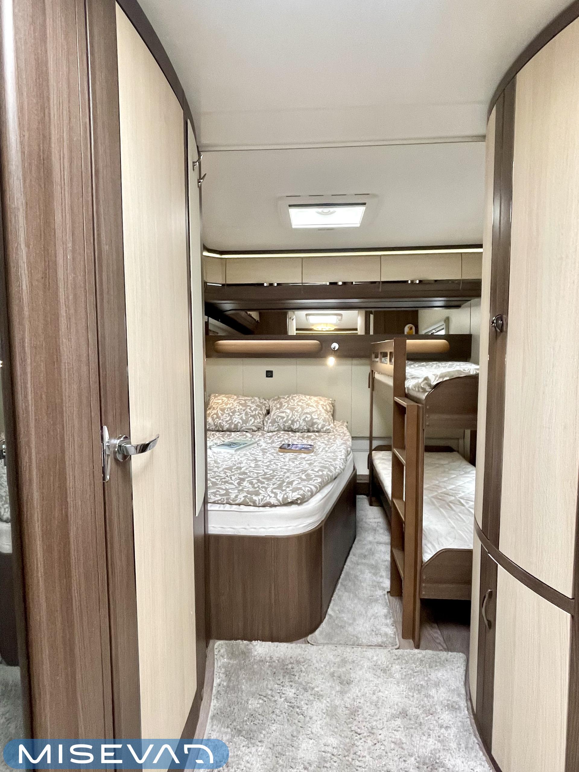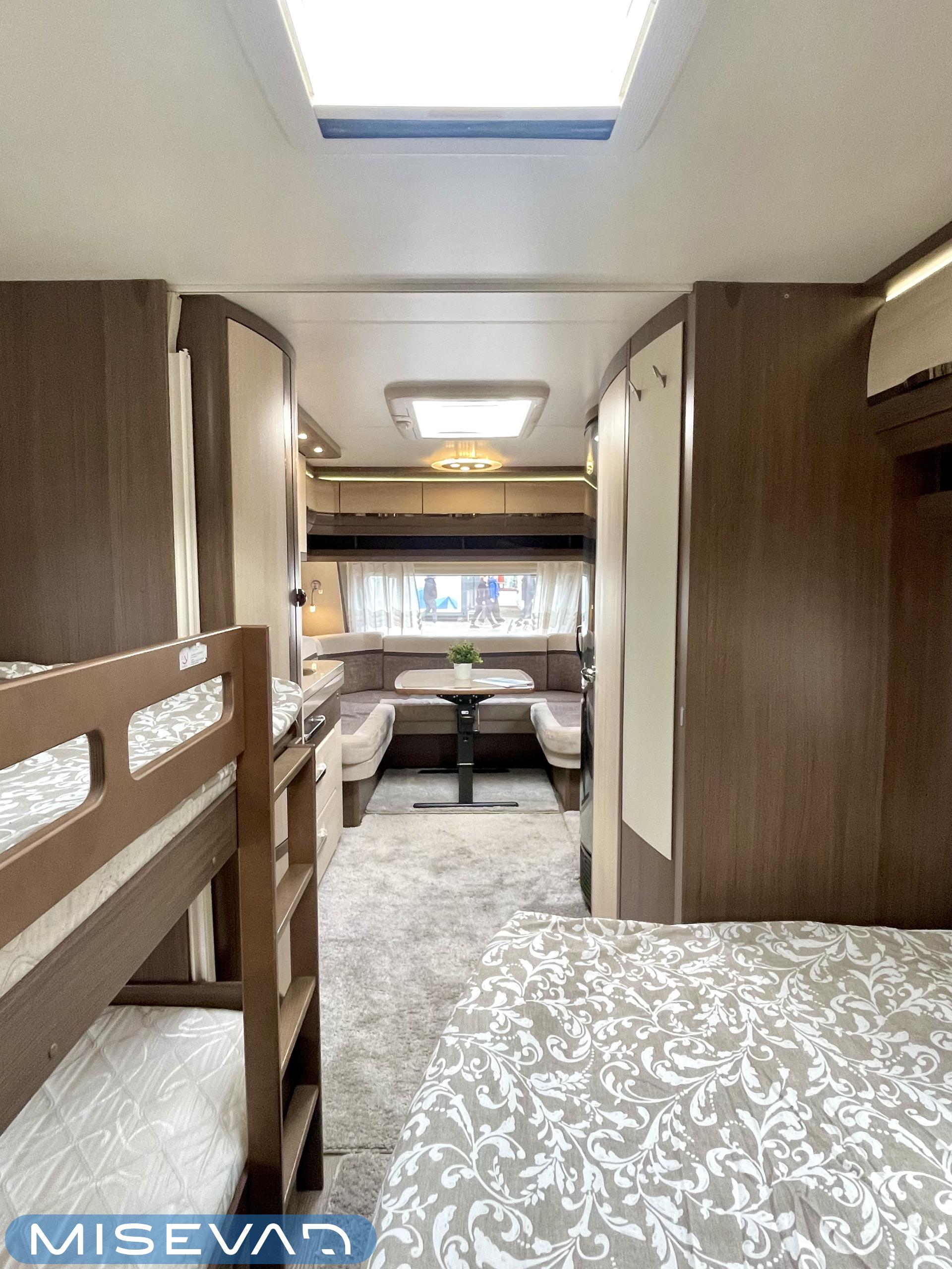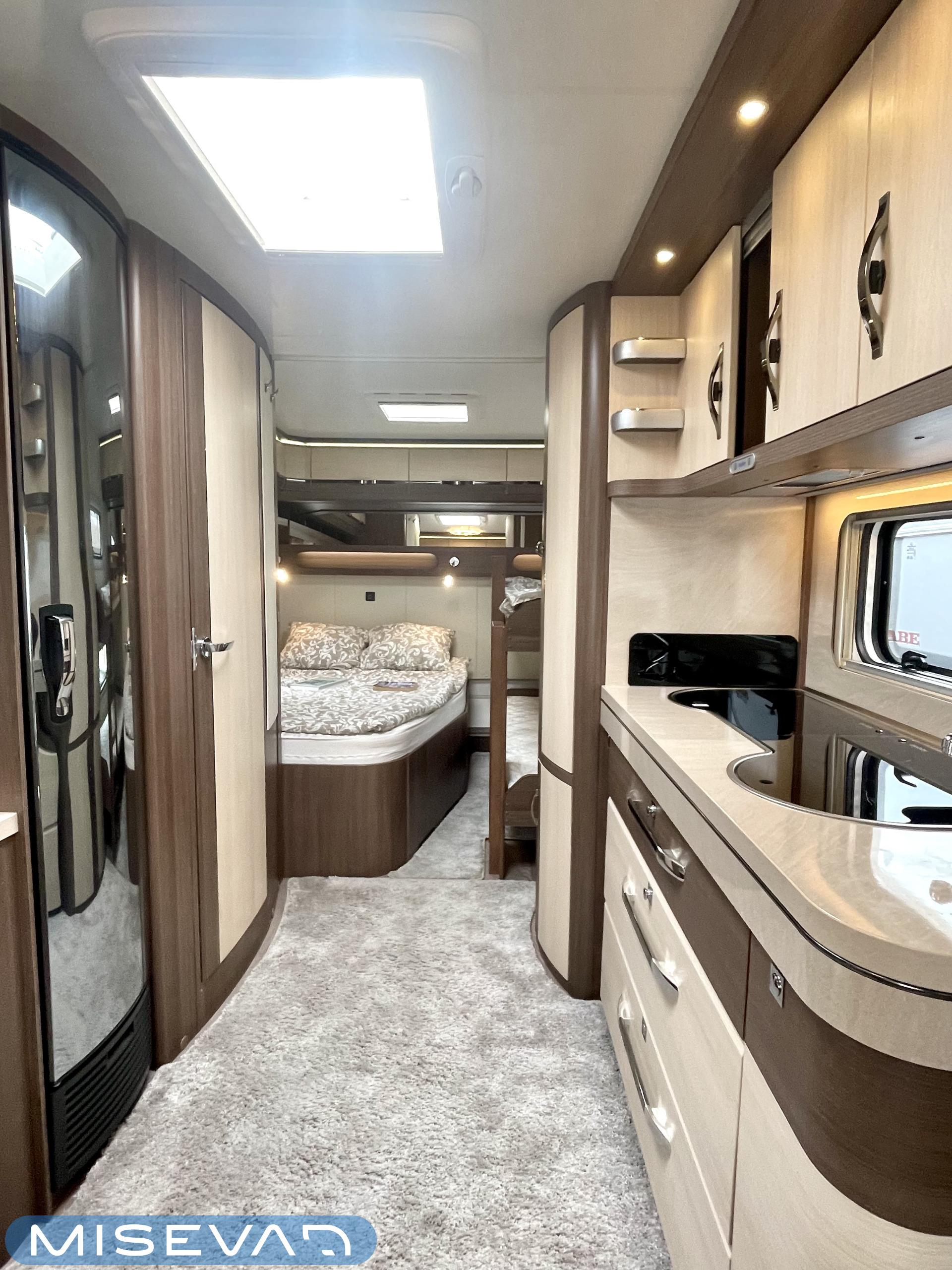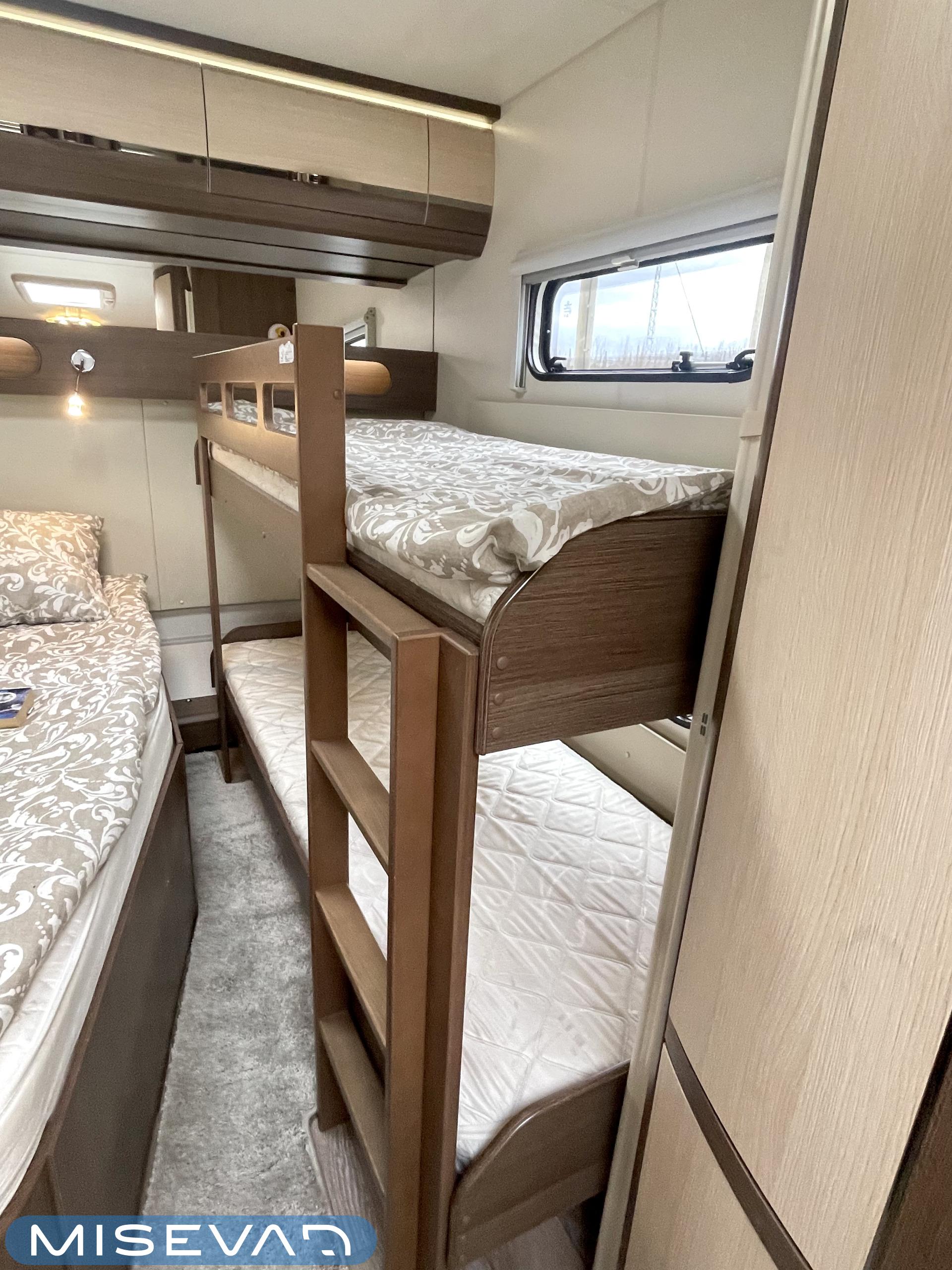 Alde, Elpatron, Kylskåp, Kassettoalett, Kassettgardiner, Taklucka, Våningssäng, Spis, Varmvattenberedare, Mikrovågsugn, Vätsecirkulationsvärme, Frysfack, Parsäng, Tvättho, Stödben, kwh-mittari