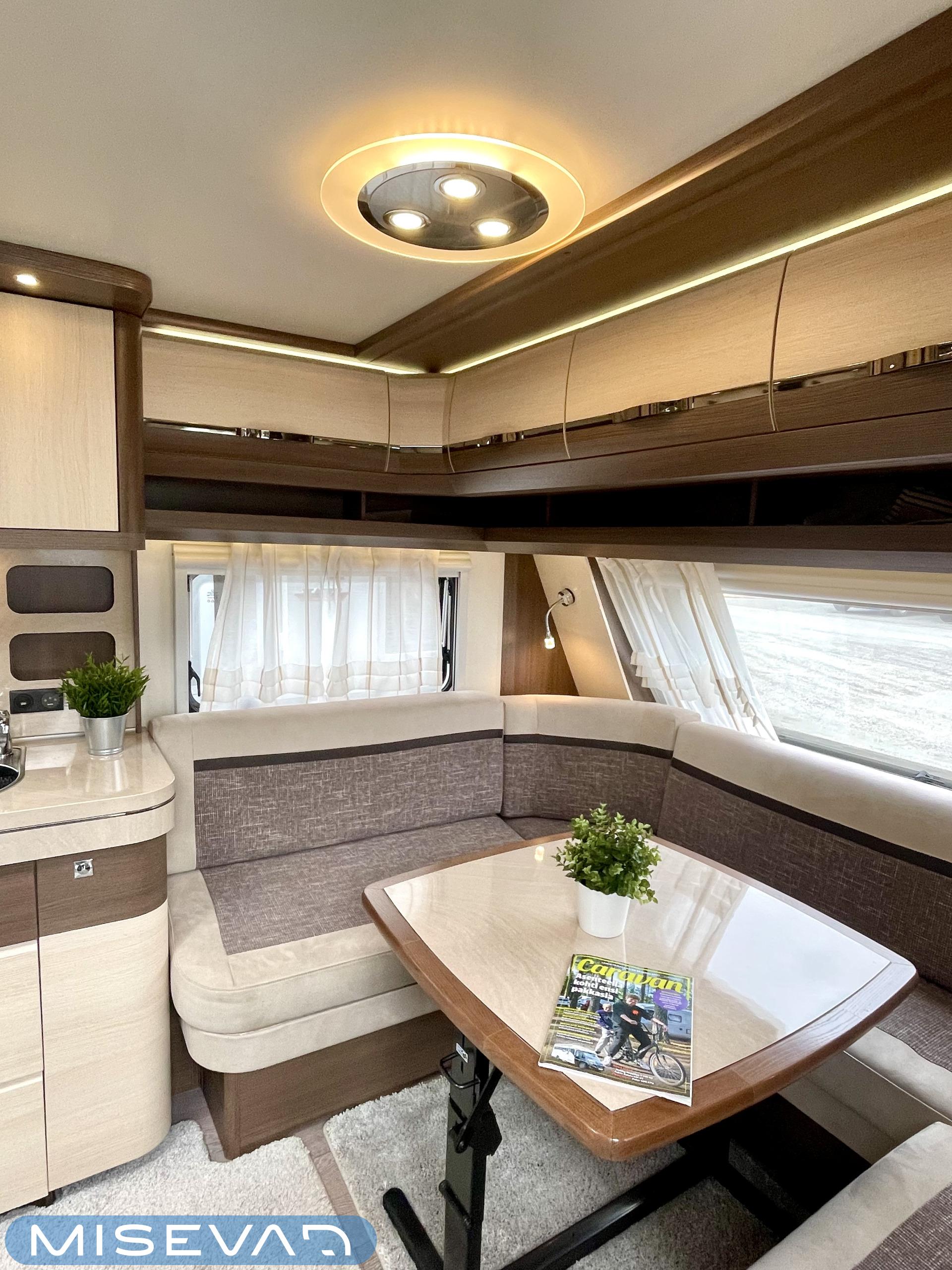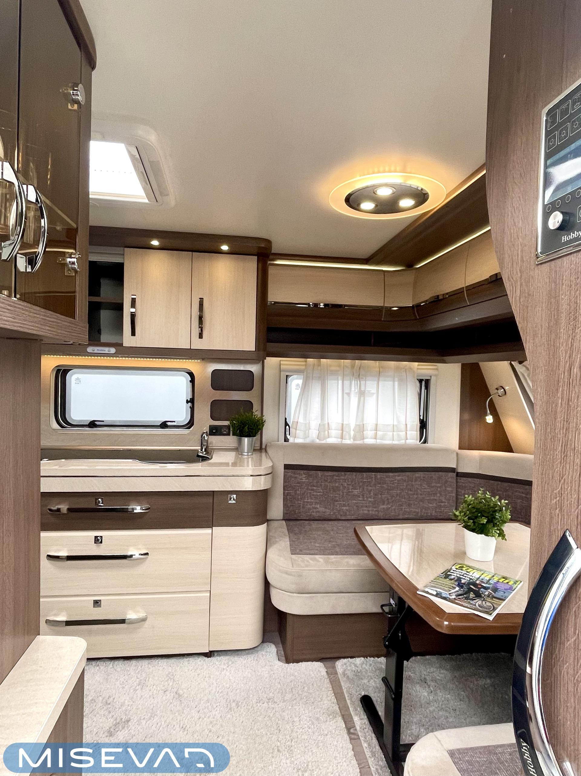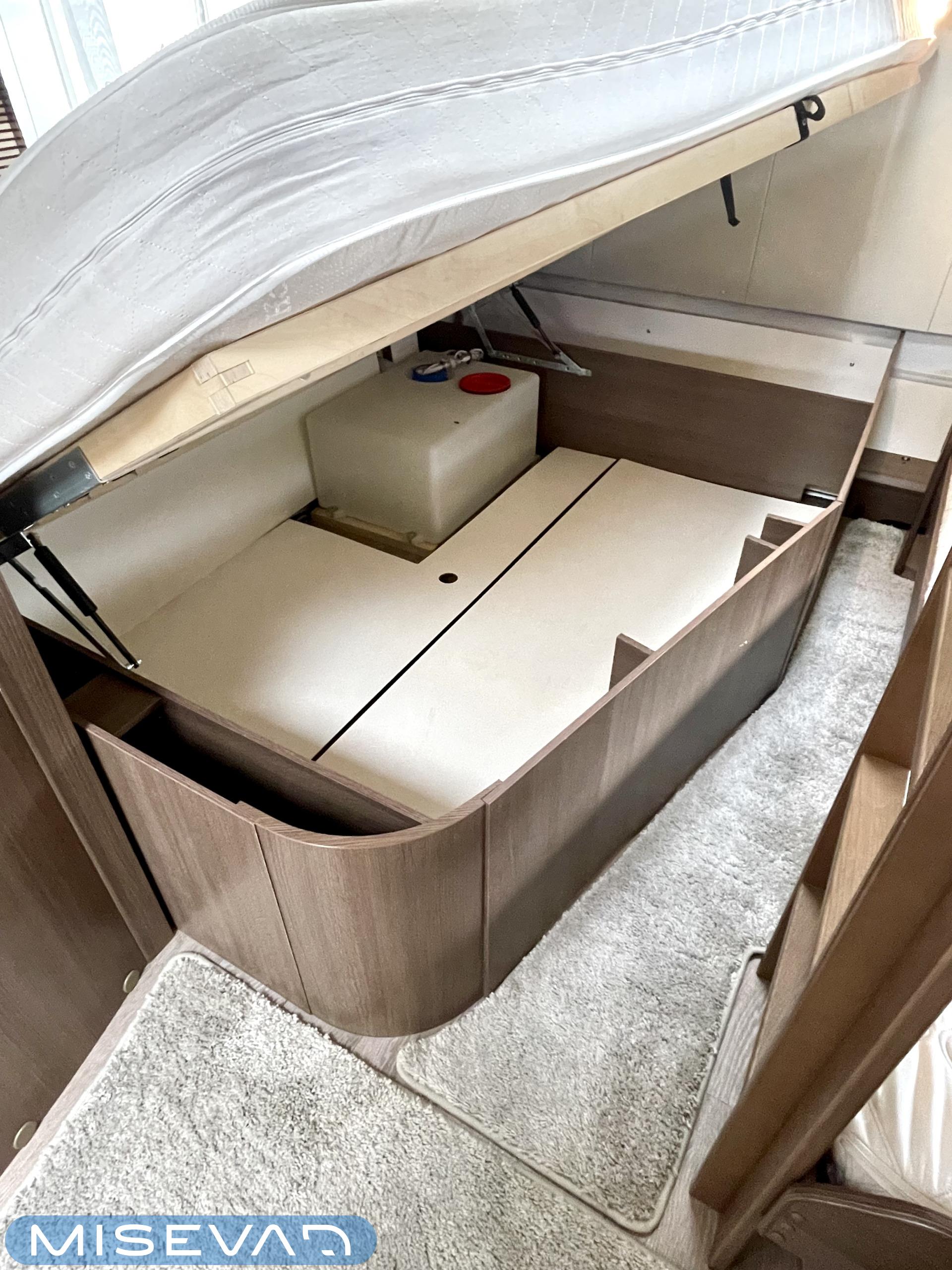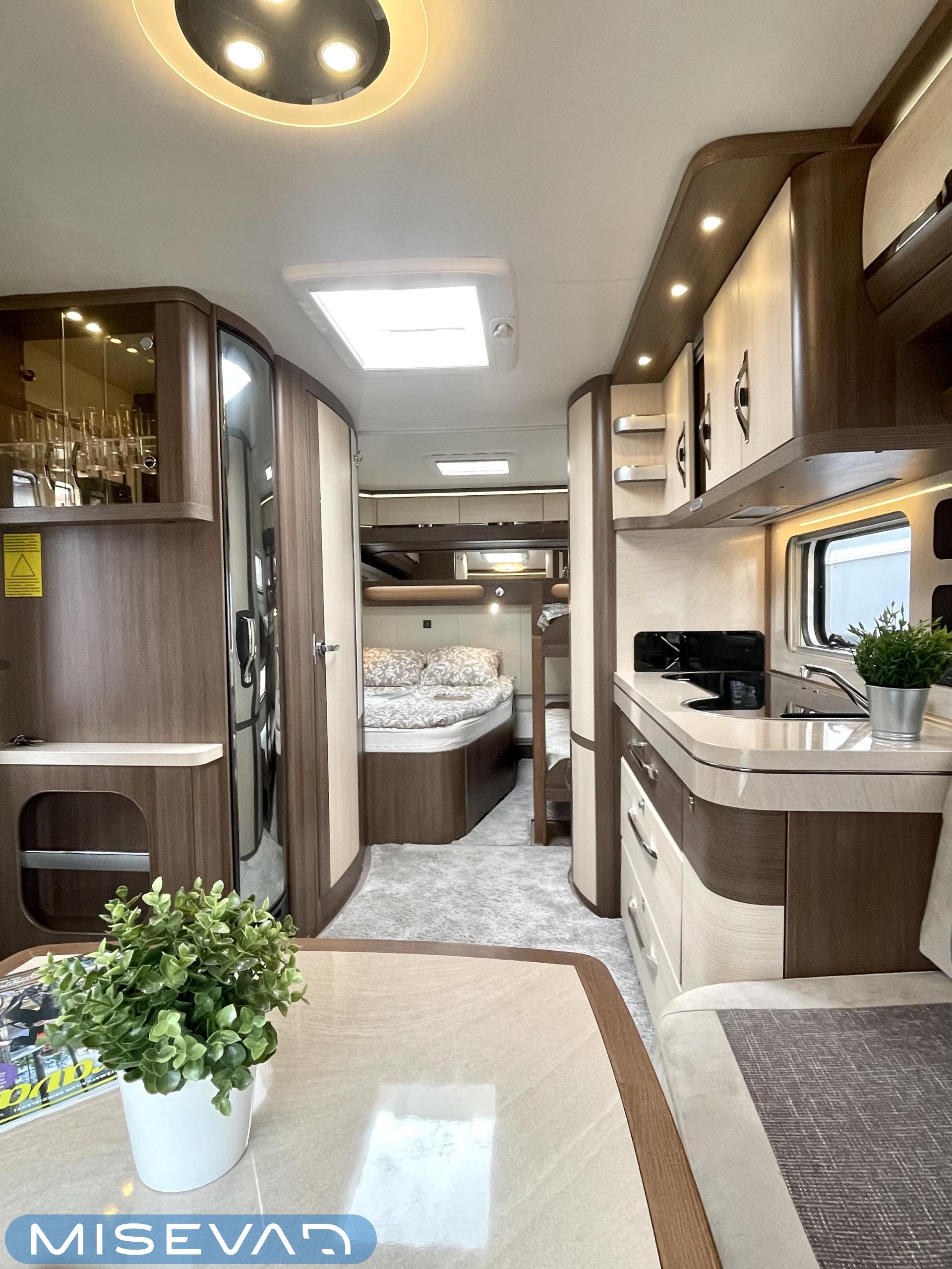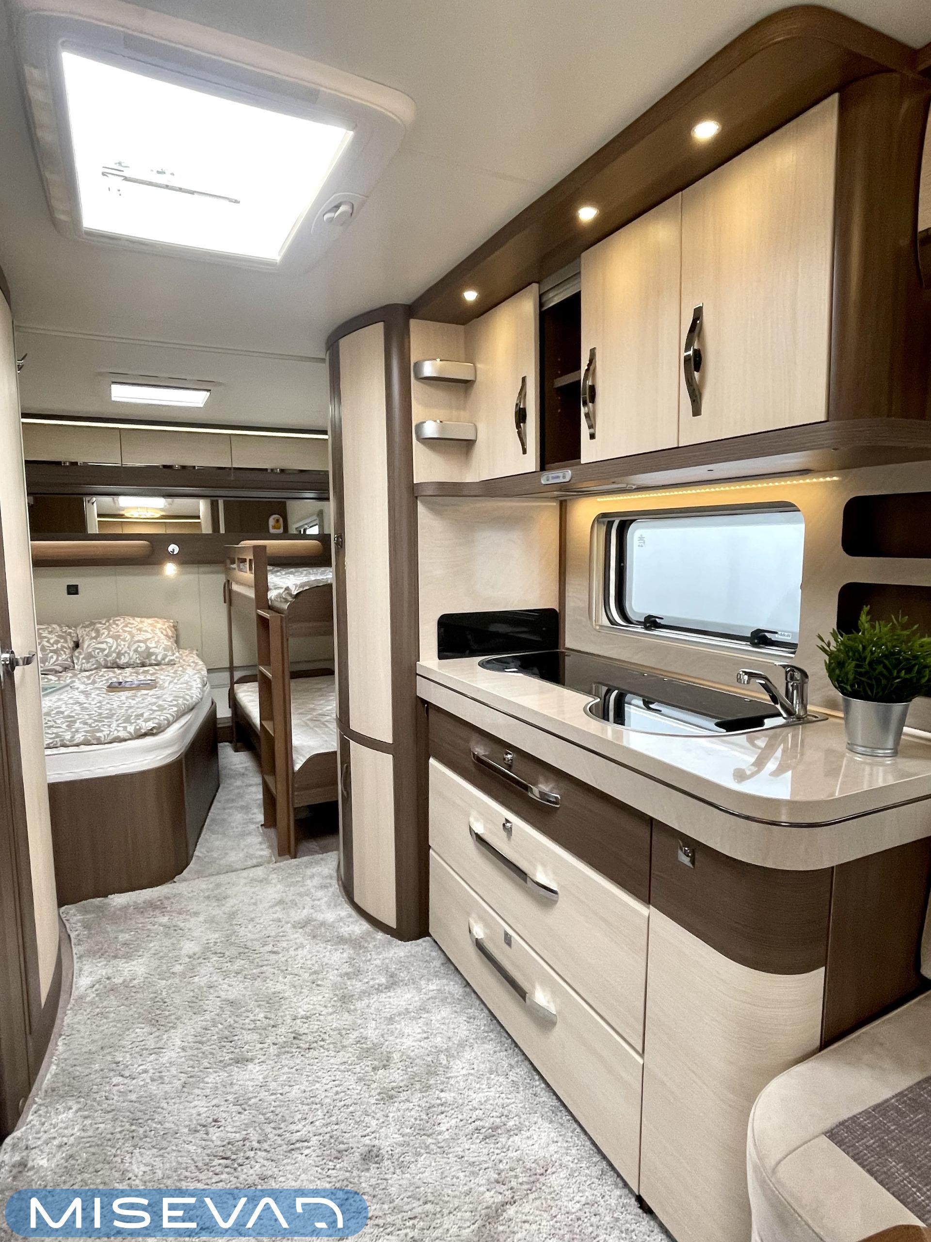 Alde, Elpatron, Kylskåp, Kassettoalett, Kassettgardiner, Taklucka, Våningssäng, Spis, Varmvattenberedare, Mikrovågsugn, Vätsecirkulationsvärme, Frysfack, Parsäng, Tvättho, Stödben, kwh-mittari