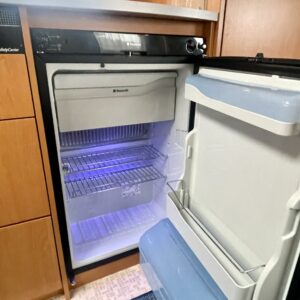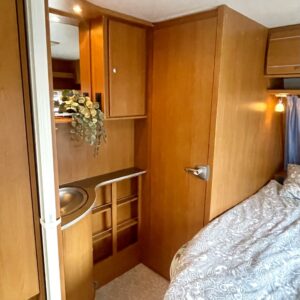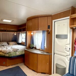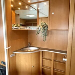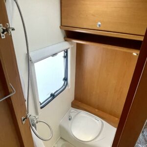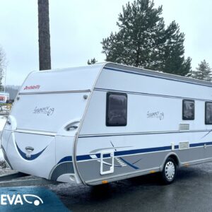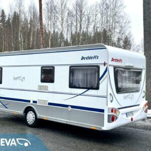 Kylskåp, Kassettoalett, Kassettgardiner, Taklucka, Spis, Varmvattenberedare, Markis, Frysfack, Parsäng, Tvättho, Elpatron, Trumatic, kaasun ulosotto, Asuinosan hyttysovi/verho