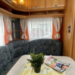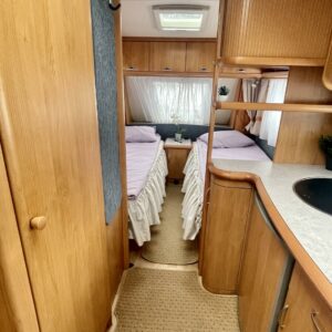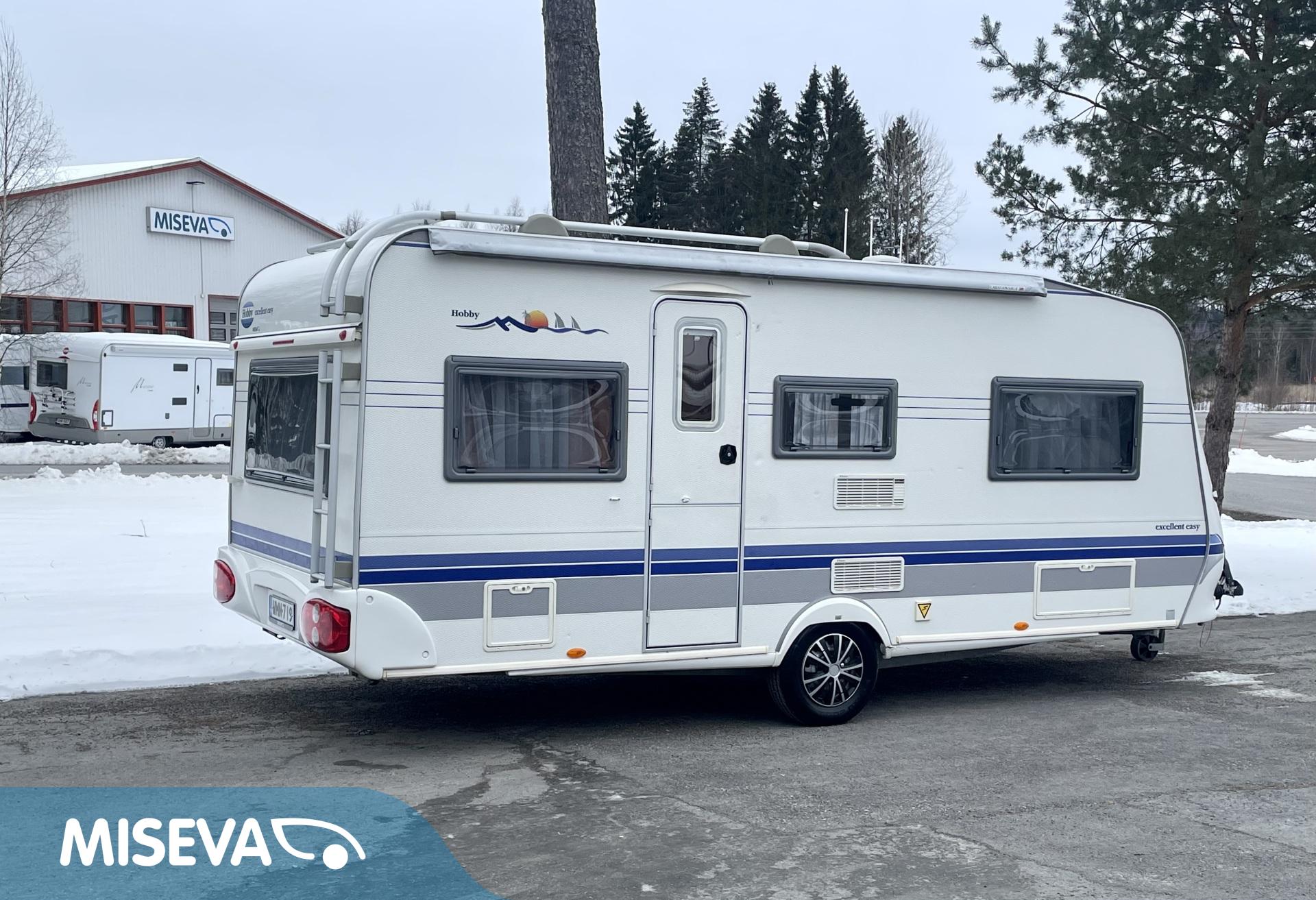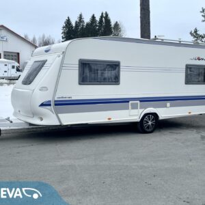 Separata sängar, Kylskåp, Kassettoalett, Kassettgardiner, Takstänger/stege, Taklucka, Golvmattor i boendedelen, Spis, Varmvattenberedare, Markis, Frysfack, Tvättho, Elpatron, Trumatic, Stödben, kwh-mittari, sähkön ulosotto
