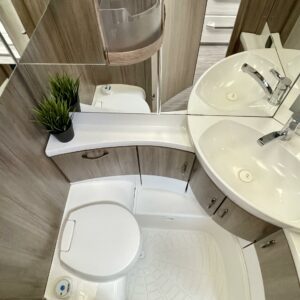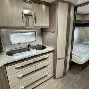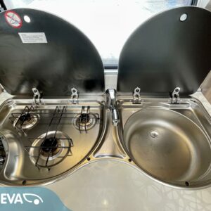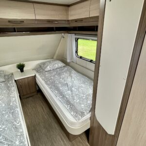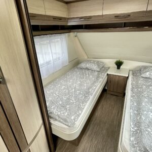 Alde, Separata sängar, Kassettgardiner, Kassettoalett, Elpatron, Stödben, Varmvattenberedare, Taklucka, Golvvärme, Spis, Frysfack, Tvättho, Kylskåp, Mikrovågsugn