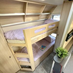 Alde, Frammarkis, Kylskåp, Kassettoalett, Kassettgardiner, Taklucka, Våningssäng, Golvmattor i boendedelen, Spis, Varmvattenberedare, Markis, Vätsecirkulationsvärme, Frysfack, Parsäng, Tvättho, Cykelställ, Elpatron, Stödben
