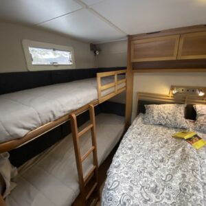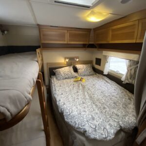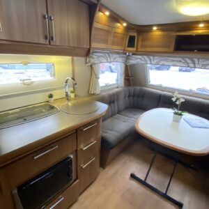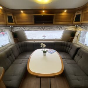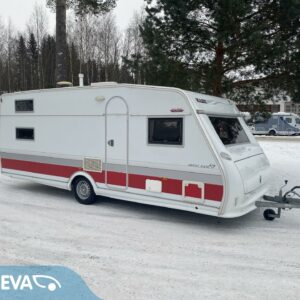 Alde, Kylskåp, Kassettoalett, Kassettgardiner, Taklucka, Våningssäng, Spis, Varmvattenberedare, Vätsecirkulationsvärme, Frysfack, Parsäng, Tvättho, Dusch, Elpatron, Stödben, kwh-mittari, kaasun ulosotto