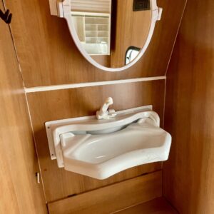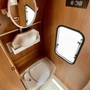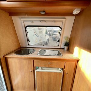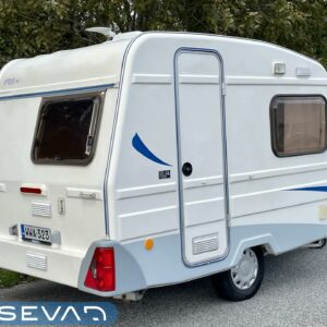 Kylskåp, Kassettoalett, Kassettgardiner, Spis, Frysfack, Parsäng, Tvättho, TV-antenni tai lautasantenni, Truma, Taklucka, Stödben, Solpanel