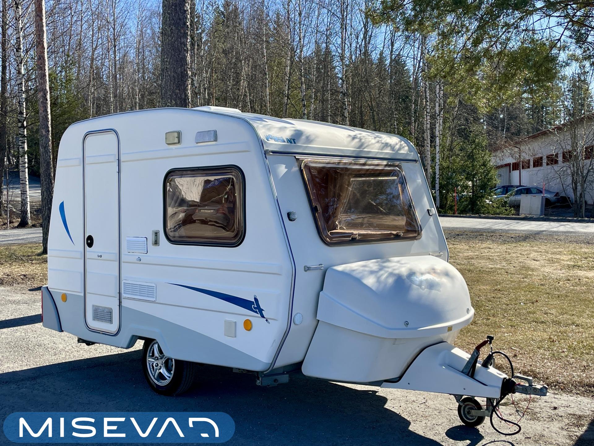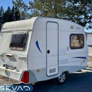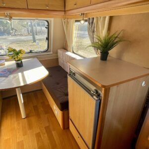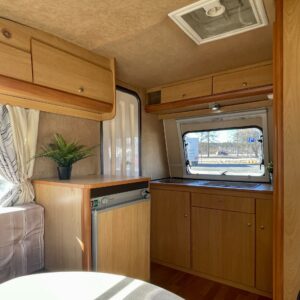 Lattialämmitys (sähkö), Kylskåp, Kassettoalett, Kassettgardiner, Taklucka, Spis, Frysfack, Parsäng, Tvättho, Bakre kök, Stödben