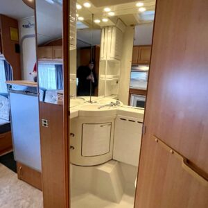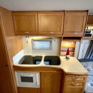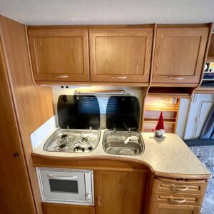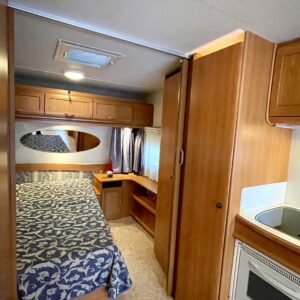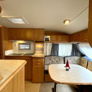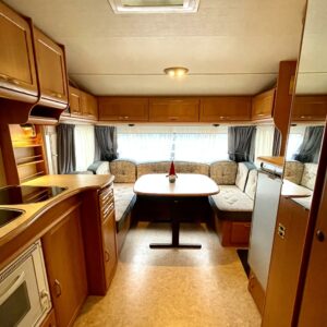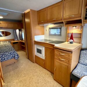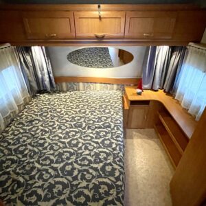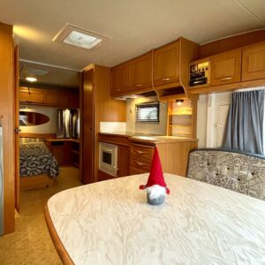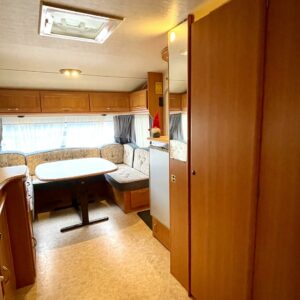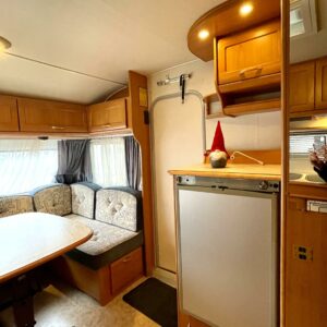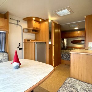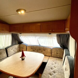 Primus, Elpatron, Kylskåp, Gasugn, Kassettoalett, Kassettgardiner, Taklucka, Våningssäng, Golvvärme, Vätsecirkulationsvärme, Parsäng, Radio, TV-antenni tai lautasantenni
