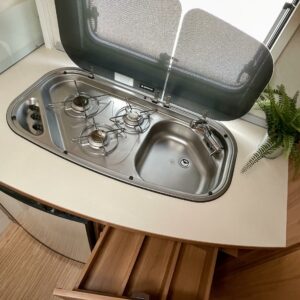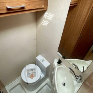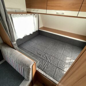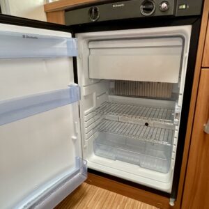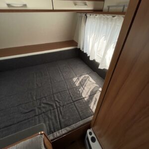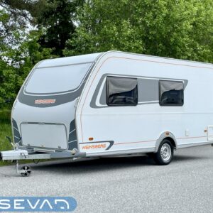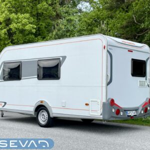 Truma, Kylskåp, Kassettoalett, Kassettgardiner, Taklucka, Spis, Varmvattenberedare, Frysfack, Parsäng, Stödben, TV-antenni tai lautasantenni
