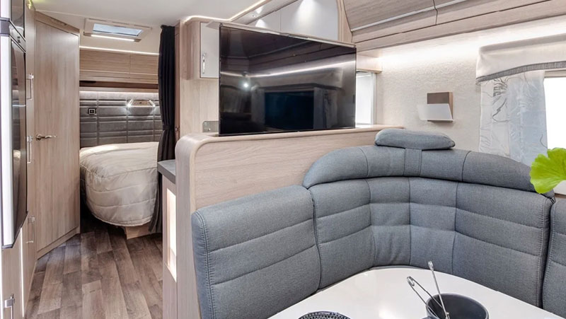 Royal ja Imperial 600 CXL -mallissa on suuri ja mukava sohva. Kulmakeittiötä vasten olevassa selkänojassa on korkeussäädettävä tv-kiinnike suuremmalle televisiolle, jonka saa helposti pois näkyvistä, kun sitä ei käytetä. Muita KABE-vaunu-uutuuksia ovat muun muassa Estate- ja Jalokivi-mallien päivitetyt sähköjärjestelmät ja ohjauspaneelit.