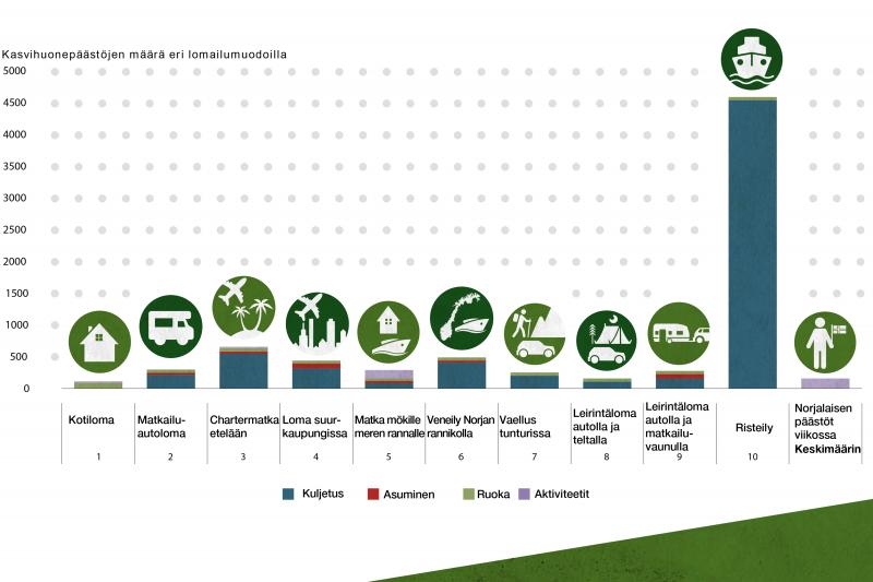 Vaikka matkailuautojen päästöt ovat hieman muita autoja suuremmat, lomailumuotona se on yksi parhaista ympäristövaihtoehdoista. – Esimerkiksi risteilymatkat ovat yksi huonoimmista vaihtoehdoista, Alf Ekström jatkaa. Hän saa mielipiteelleen tukea norjalaisen toimialajärjestön Norges Caravanbransjeforbundin (NCB) teettämästä suuresta tutkimuksesta, jossa se on laskenut, mitkä lomailumuodot vaikuttavat eniten ympäristöön. Tutkimuksen suoritti norjalainen Østfoldforskning, jonka tehtävänä oli selvittää eri kuljetusvälineiden kasvihuonekaasut käytettäessä niitä lomailutarkoituksiin.